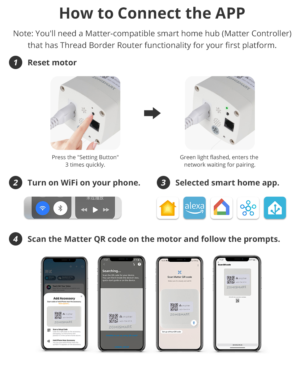 - A 'Matter enabled hub' is necessary to add this Matter Devices to the 'Homekit/Smartthings/Google Home/Alexa/Home Assistant' app; Configured WiFi network and Matter-enabled hub must in the same local area network(LAN).