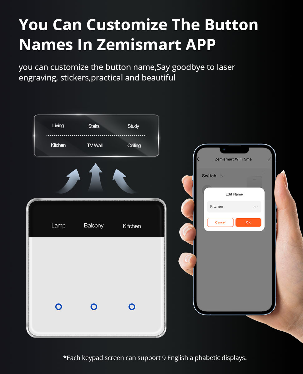 support modifying the name of the button on the Tuya APP, and it will be fed back to the switch screen in real time, saying goodbye to stickers, convenient and beautiful.