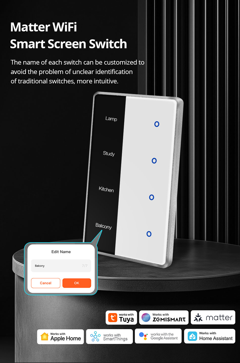 • Zemismart Matter over Wifi DIY Name Switch Smart Display Screen Light Touch US Switch  Alexa Google Home HomeKit Siri Voice Control SAA