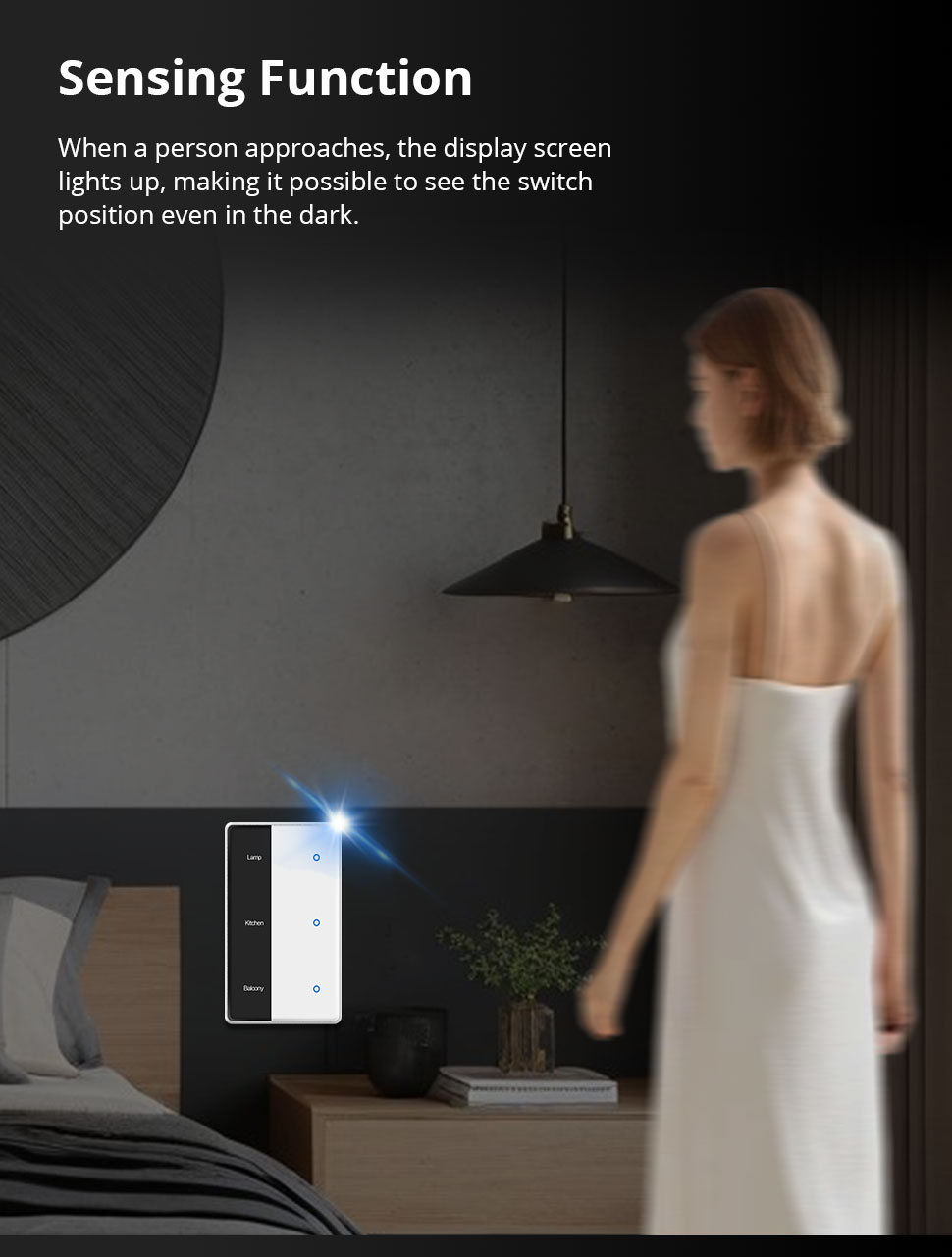 When a person approaches, the display screen lights up, making it possible to see the switch position even in the dark.