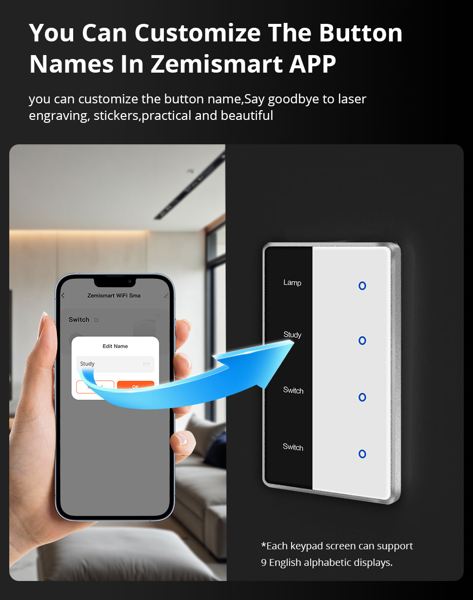 support modifying the name of the button on the Tuya APP, and it will be fed back to the switch screen in real time, saying goodbye to stickers, convenient and beautiful.